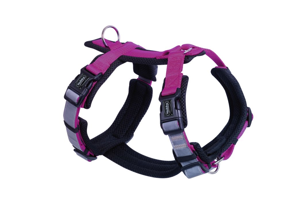 Pevný hrubý postroj z nylonu a sieťoviny pre psov s reflexnými pásikmi Nobby Daily Walk Comfort L v malinovej farbe.