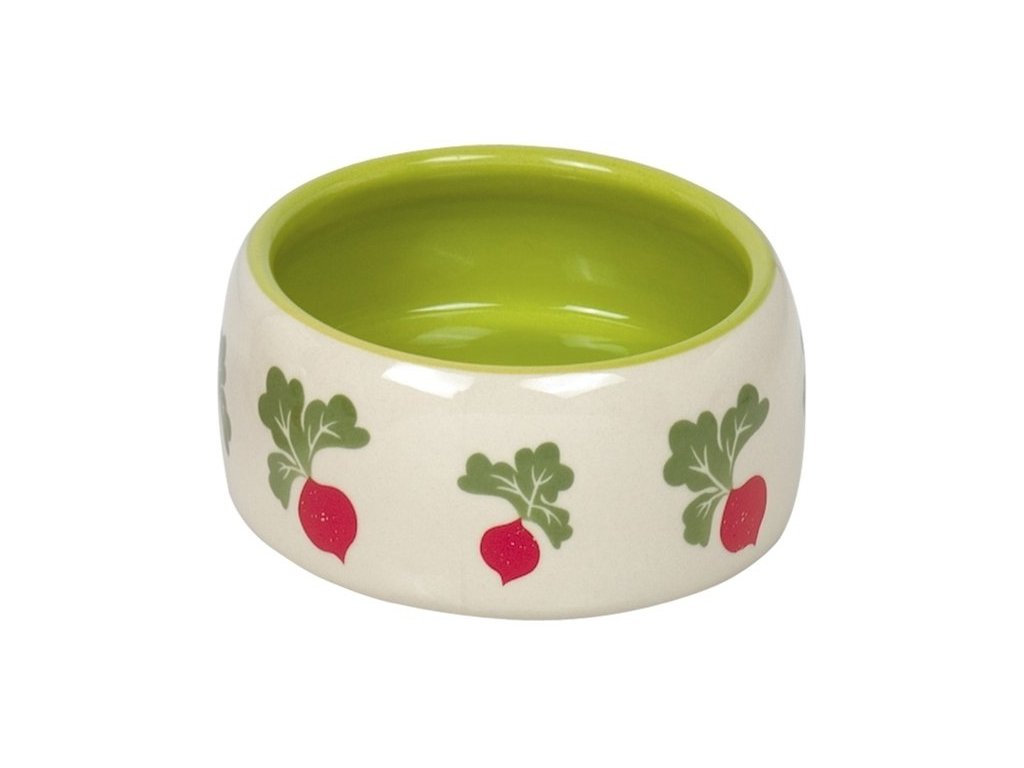 Okrúhla keramická miska pre hlodavce od Nobby bude zaručene vkusným a praktickým doplnkom v chove každého domáceho maznáčika. Miska je vnútri zelená, z vonkajšej strany biela, má lesklú glazúru a je zdobená potlačou reďkoviek.