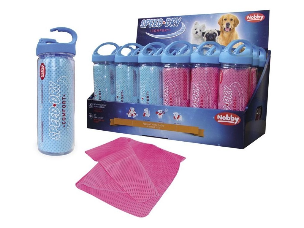 Extra savý vlhký uterák pre psov Nobby Speed Dry Comfort pre ľahké očistenie a vysušenie srsti psa v svetlomodrej a ružovej farbe. Balenie: 1ks