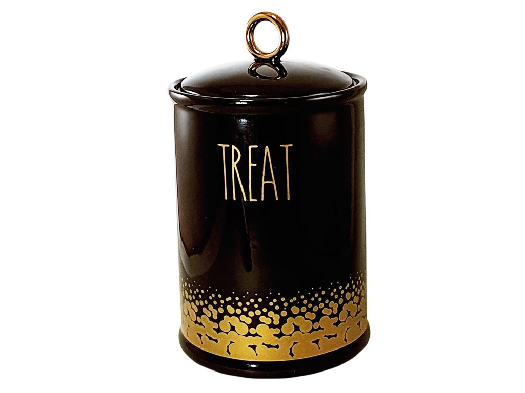 Keramická nádoba na občerstvenie "Treat" má hladký čierny povrch a je zdobená zlatými prvkami. Elegantný dizajn dokonale zapadne do každej módnej domácnosti a možno ho použiť aj ako krásny dekoračný predmet v kuchyni. S nádobou na občerstvenie možno maškrty pre vášho štvornohého priateľa bezpečne uložiť. Vďaka veku so silikónovým krúžkom, ostane maškrta, alebo krmivo dlhšie čerstvé a aromatické.