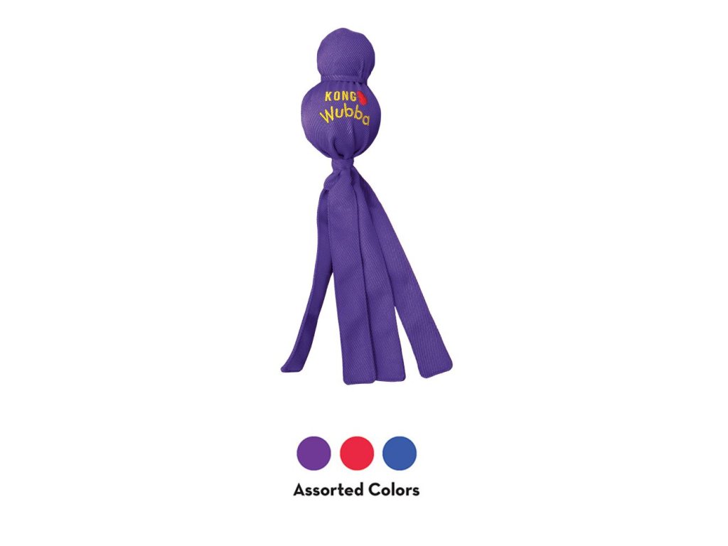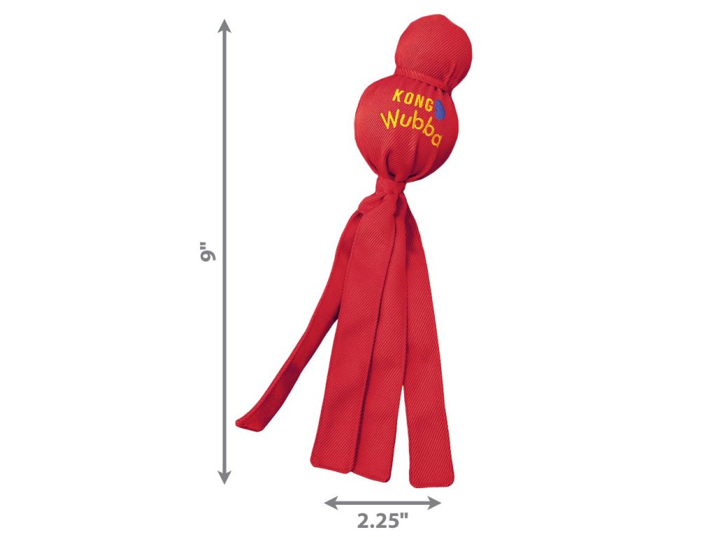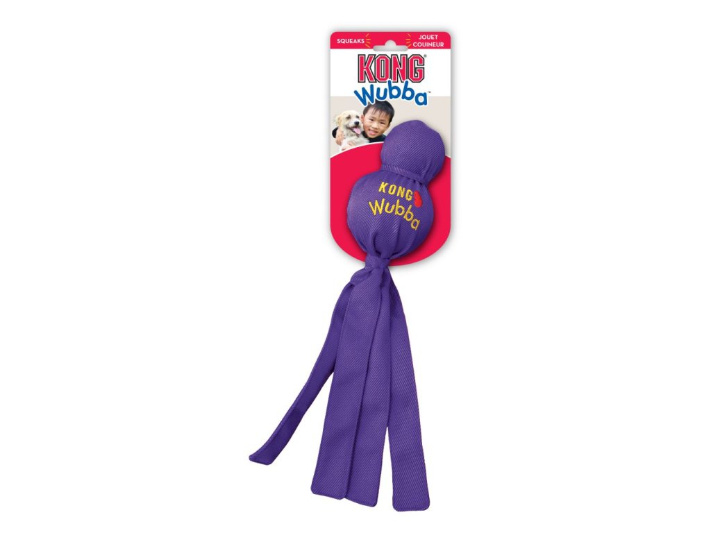 Je mnohostranne použiteľná - k hádzaniu, aportovaniu a lomcovaniu. KONG® Wubba spája toľko možností hier ako žiadna iná hračka. Skladá sa z dvoch rozdielne veľkých loptičiek, ktoré sú potiahnuté mimoriadne odolným nylonovým materiálom. Súčasťou väčšieho loptičky je pískatko. Vďaka dlhým šnúrkam je hračka KONG® Wubba vhodná na aportovanie.