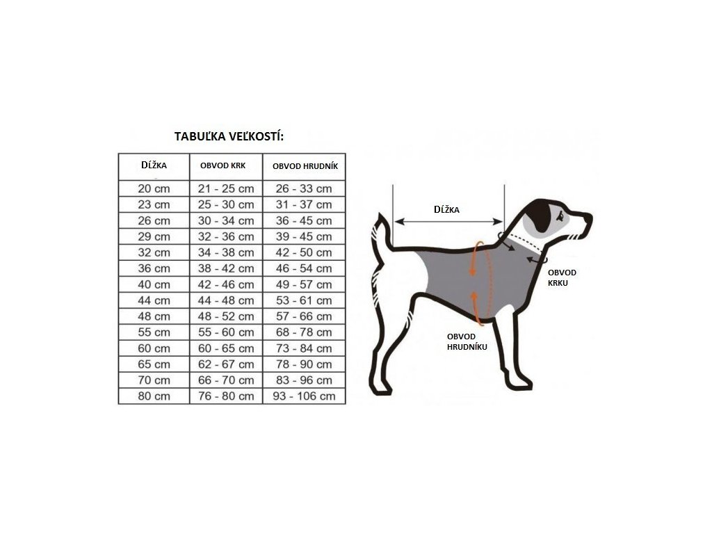- následne premerajte obvod pri krku a obvod hrudníka (najširšie miesto za prednými labkami, vid. obrázok "tabuľka veľkostí" - oranžová šípka)