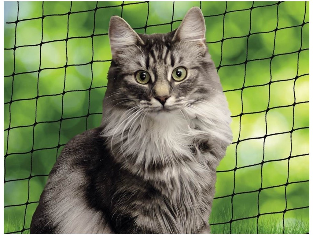 Pevná sieť pre mačky do vnútorných aj vonkajších priestorov Nobby s veľkosťou ôk 3x3cm a ceľkovej veľkosti L - 8x3m v čiernej farbe. Balenie obsahuje aj súčiastky na pripevnenie siete.