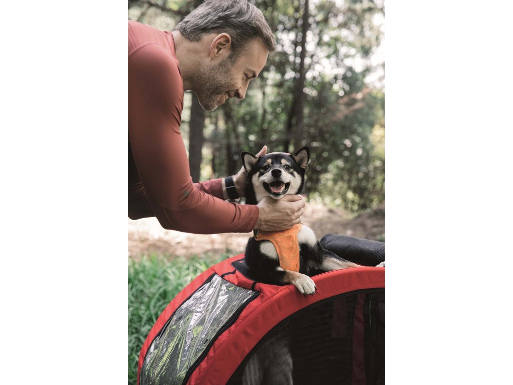 Príves ponúka vášmu miláčikovi skutočný panoramatický výhľad. Strecha, zadné a predné okná zop sieťoviny sa dajú jednoducho otvárať zipsom. V nepriaznivom počasí sa dá strecha a predná časť rýchlo zakryť a neskôr jednoducho zrolovať a zafixovať suchým zipsom. Súčasťou prívesu je karabína a vodítko na pripútanie vášho psa, či mačky.