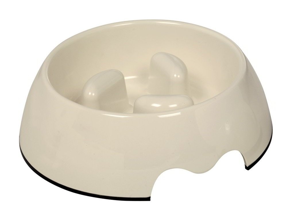 Pomalé prijímanie potravy prináša celý rad výhod. Skôr sa u Vášho psa dostaví pocit sýtosti a predíde sa prežraniu. Tiež sa predĺži fáza žuvania, čo podnecuje slinenie a pomáha tak zažívaniu. Súčasne sa starostlivým rozhryznutím potravy čistia zuby Vášho maznáčika. Melamín je špeciálna umelá hmota, ktorá je veľmi ľahká a zároveň odolná proti poškriabaniu i nárazu a vyznačuje so dlhou životnosťou a odolnosťou voči pôsobeniu teplôt. Jej povrch podobný takmer porcelánu z nej robí obzvlášť hygienický materiál. Preto je melamín ideálny pre použitie pri práci s potravinami. Misku je možné umývať v umývačke riadu. Na spodnej strane misky je gumový krúžok, ktorý garantuje, že miska nekĺže.