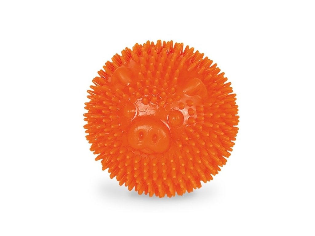 Špicatá odolná žuvacia hračka z kvalitného matriálu - TPR pre štenatá od firmy Nobby o veľkosti 6,5cm v tvare lopty s prasacou tvárou vo farbe oranžová.